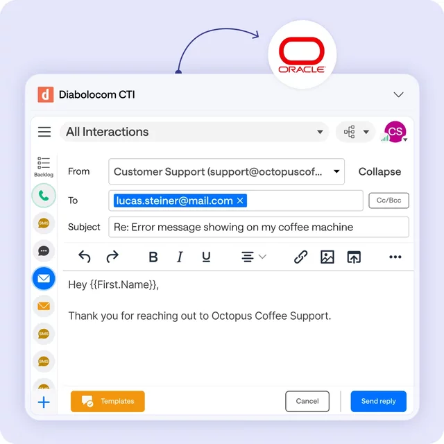 O Oracle Service Cloud integration conecta o seu banco de dados Oracle à plataforma Diabolocom. Cada chamada ou interação é registrada e atualizada automaticamente em ambos os sistemas, garantindo dados de clientes consistentes e precisos.